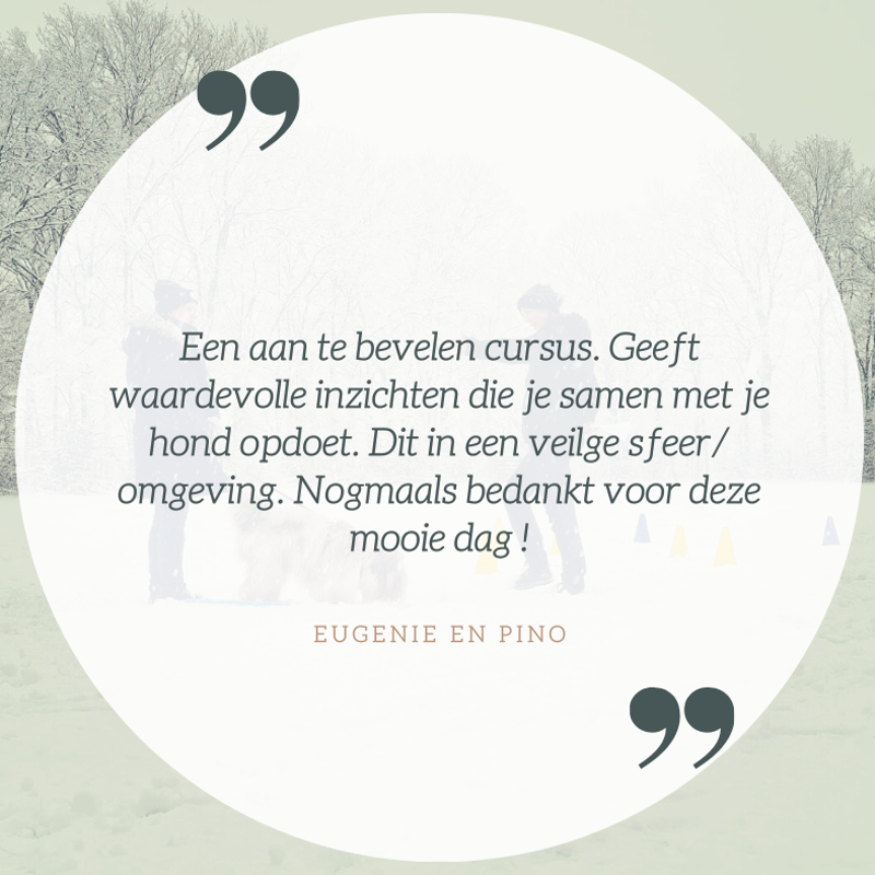 Je neemt je eigen hond mee naar de cursus. Neem daarom ook een plaats mee voor je hond, een speeltje of snuffelmat én voldoende beloningssnacks.